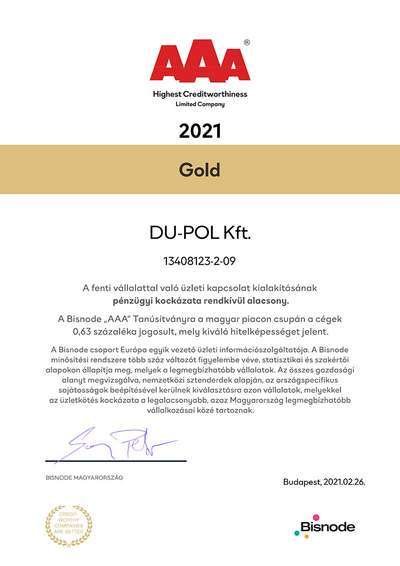 A DU-POL Kft. a Bisnode AAA (tripla A) tanúsítványát kapta meg, mellyel Magyarországon csupán a cégek 0,63 %-a rendelkezik, és azt jelzi, hogy velünk az üzleti kapcsolat kialakításának pénzügyi kockázata rendkívül alacsony.