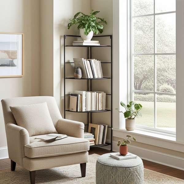 A sarokpolc elegendő helyet biztosít különféle nagyméretű növények vagy könyvek számára. Dekorációs elemek tárolására is alkalmas polcként is használható. A porszórt acélváznak köszönhetően a fém álló sarokpolc beltéri és kültéri használatra is alkalmas.